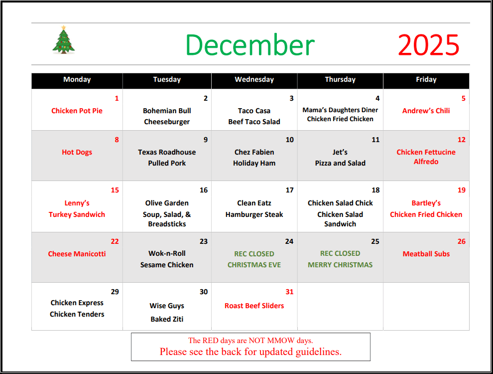 Metroport Meals On Wheels @ 817.491.8534. This is a part of MMOW mission and meals are to be had at The REC to promote socialization.