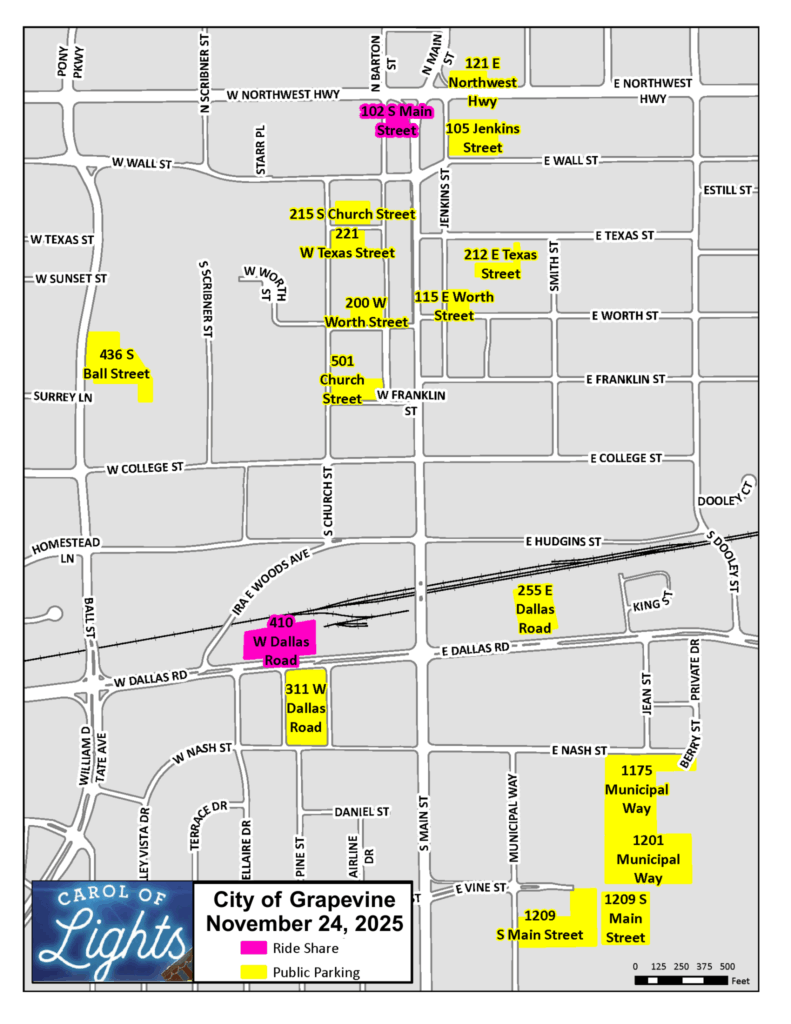 For those using ride share services, designated pick-up and drop-off locations are available at Kountry Donuts (102 S. Main St.) and the High Railer Parking Lot (410 W. Dallas Rd.).