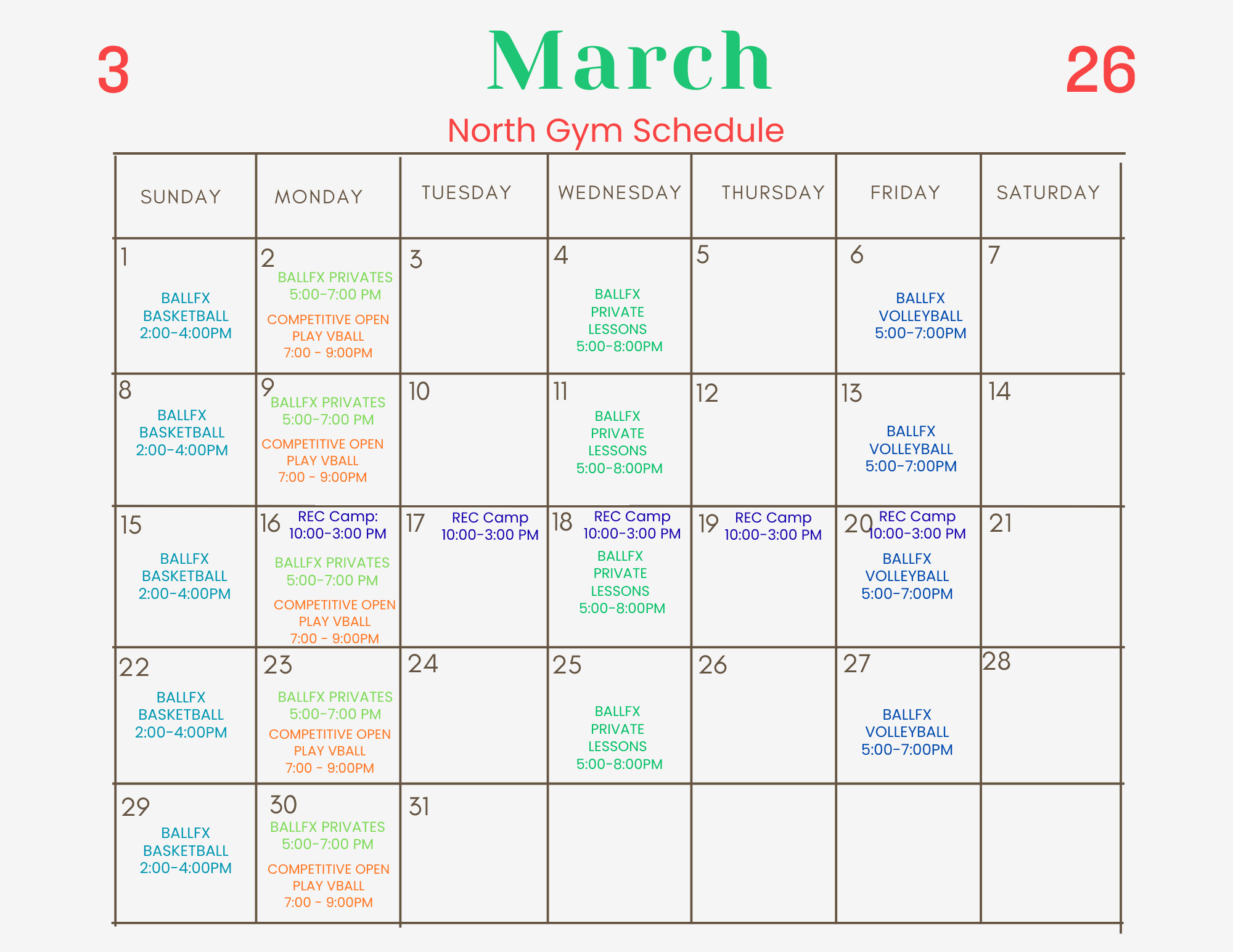 North Gym Schedule - March