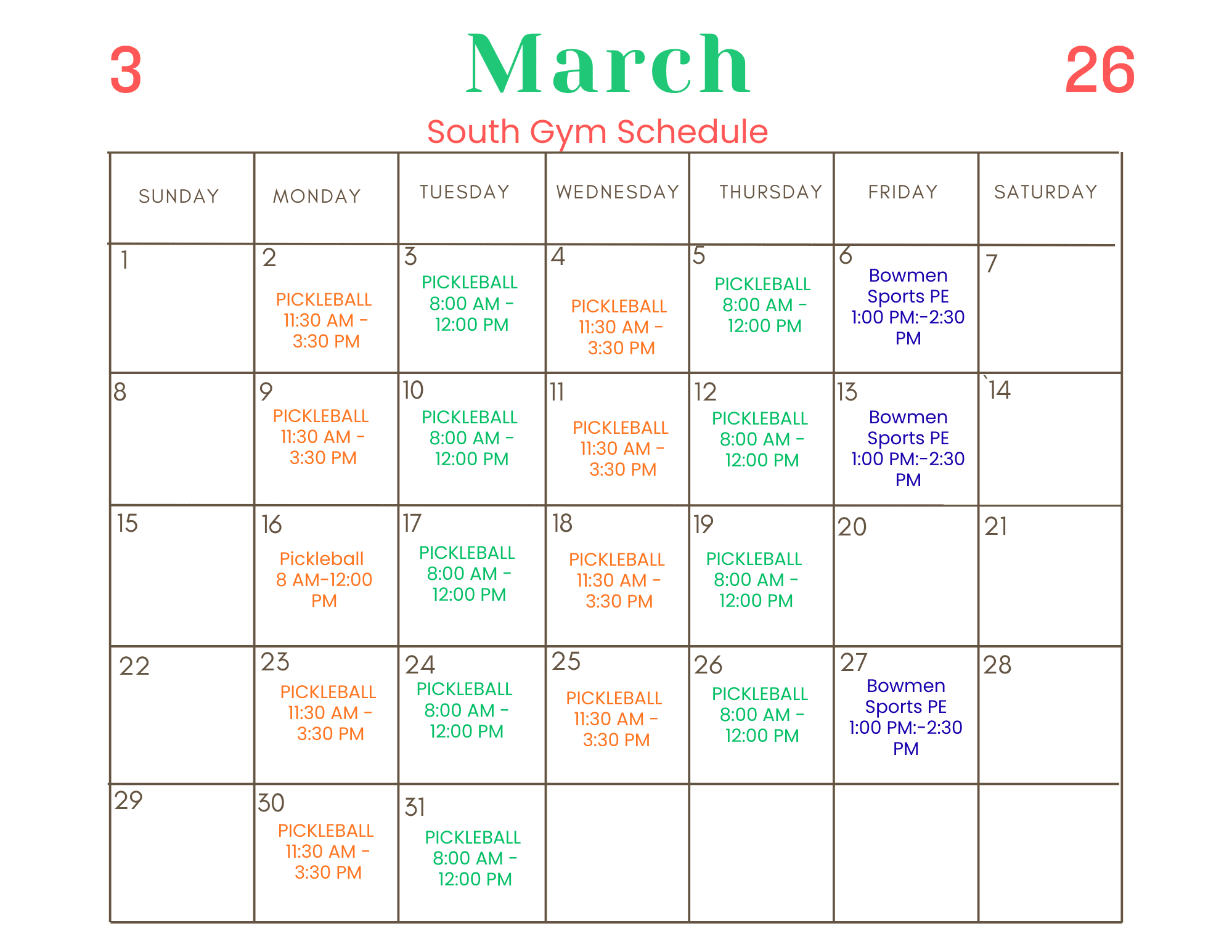 South Gym Schedule - March