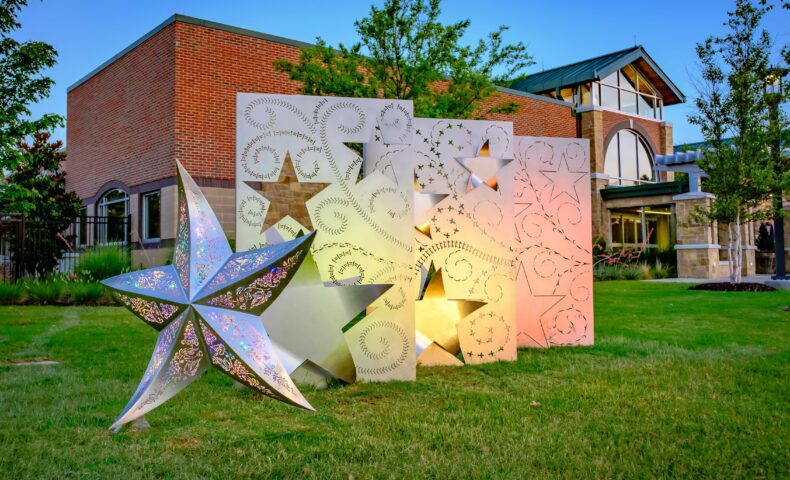The City of Stars public art piece was approved by Grapevine City Council on February 21, 2017. The artist, Joe O’Connell, founded his studio, Creative Machines, in 1995 to design and fabricate interactive exhibits. In 2004, he began making public art with a strong basis in community and interactivity. His work is rooted in science, perception and history. It can be enjoyed in museums, science centers, libraries, hospitals, university campuses, transit stops, trade shows, and public spaces across the globe. City of Stars is composed of finished stainless steel with intricate laser-cut patterns. The sculpture also features color-changing LED lighting, including custom point source lights.